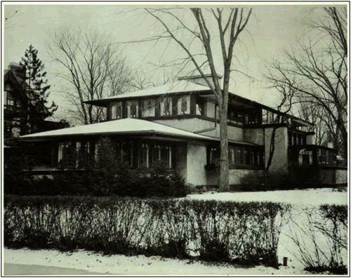 Wright helped pick the site and was paid a total sum of about $55,000 to construct the Prairie-style house at 16 East Boulevard, which has four bedrooms and three baths. Built in 1908, the design of the house was achieved in collaboration with Beulah Boynton--unusual for Wright, who didn't always get along well with his clients. Wright also designed the furniture with Beulah's input. With its low, flat roofs, overhanging eaves, long horizontal rows of windows, and sharp lines punctuated by flights of colored glass, the Boynton house looked completely different from any other dwelling in Rochester. Mr. Boynton and his daughter lived in the house until 1918, when they moved to New York City.