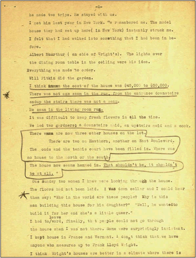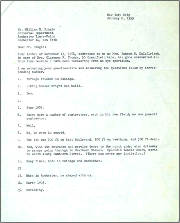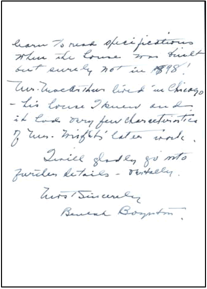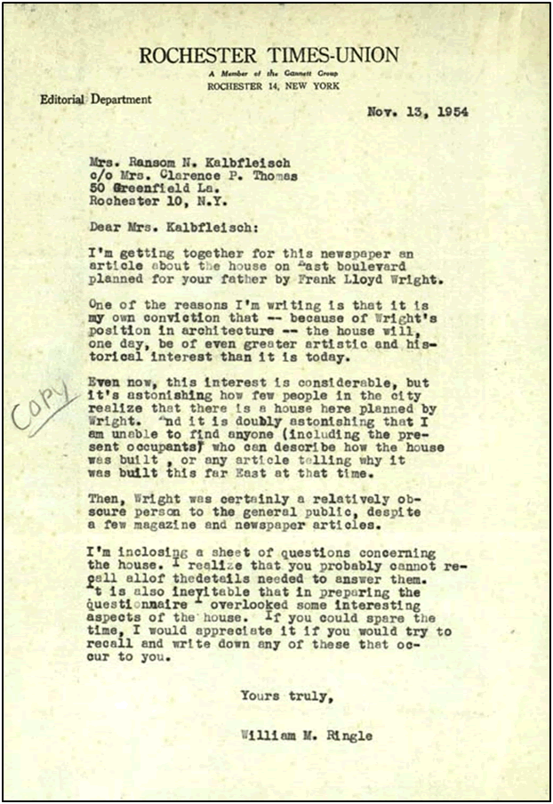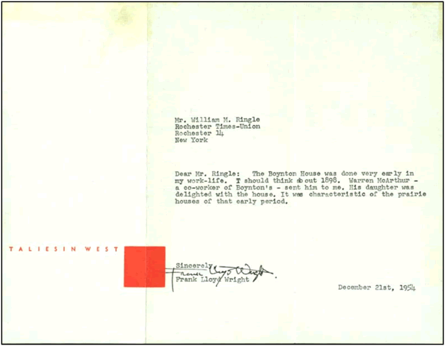 In 1954, Times-Union reporter William M. Ringle wrote to both Wright and Beulah Boynton for more information about the house for an article he was working on.