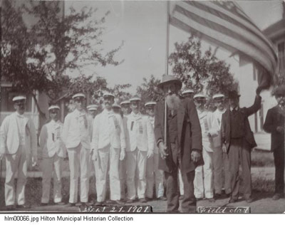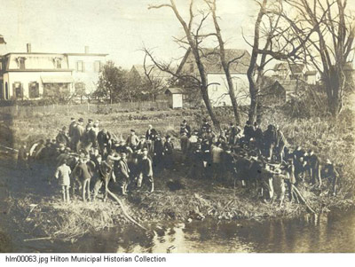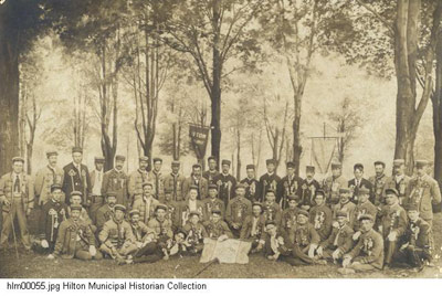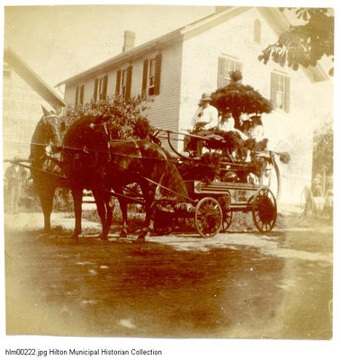 Organizing Hilton's volunteers Originally known as Unionville, the village of North Parma was incorporated in 1885 (the name was changed to Hilton in 1896). After the incorporation, village leaders decided to devise a better system than bucket brigades for fire protection. Therefore, the North Parma Fire Co. was organized in 1888 and was officially incorporated on October 31, 1889. Equipment, purchased by the village the previous year, included leather buckets, ladders, hoses and a hand-pump engine. This picture of around 1894 shows some North Parma citizens, six of whom were members of the fire department. In May of 1895 the North Parma Fire Co. faced its first major blaze at the Wright Block at the corner of East and South Avenues (later site of the Flatiron Building). The fire apparatus of the company proved to be insufficient to extinguish the flames. The fire spread and destroyed or damaged nearby buildings and homes. Citizens refused to give money to what they perceived as an ineffective company. People lost interest and the company became inactive. In 1897 village leader John E. Cooper sought to re-establish the unorganized, if not non-existent, fire department. Cooper organized the Hilton Fire Department into three fire companies: E.M. Upton Engine Co., Rescue Hook & Ladder Co. and Barnes Hose Co. Cooper also became the first fire chief, serving in this position from 1897-1899, 1903, 1904 and 1907-1910.